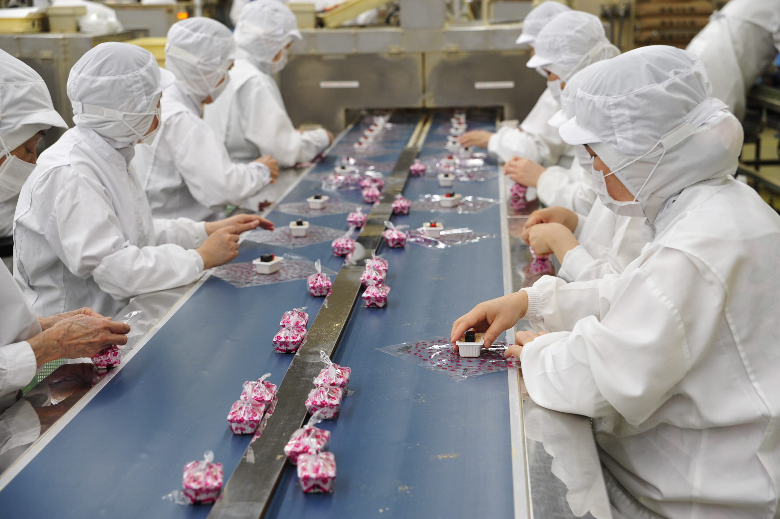皆様にお召あがりいただいているお菓子はどのように作られているのか、普段なかなか知ることができない工場内の様子を見ていただき、当社の想いを知っていただきたく、積極的に工場見学をお受けしています。